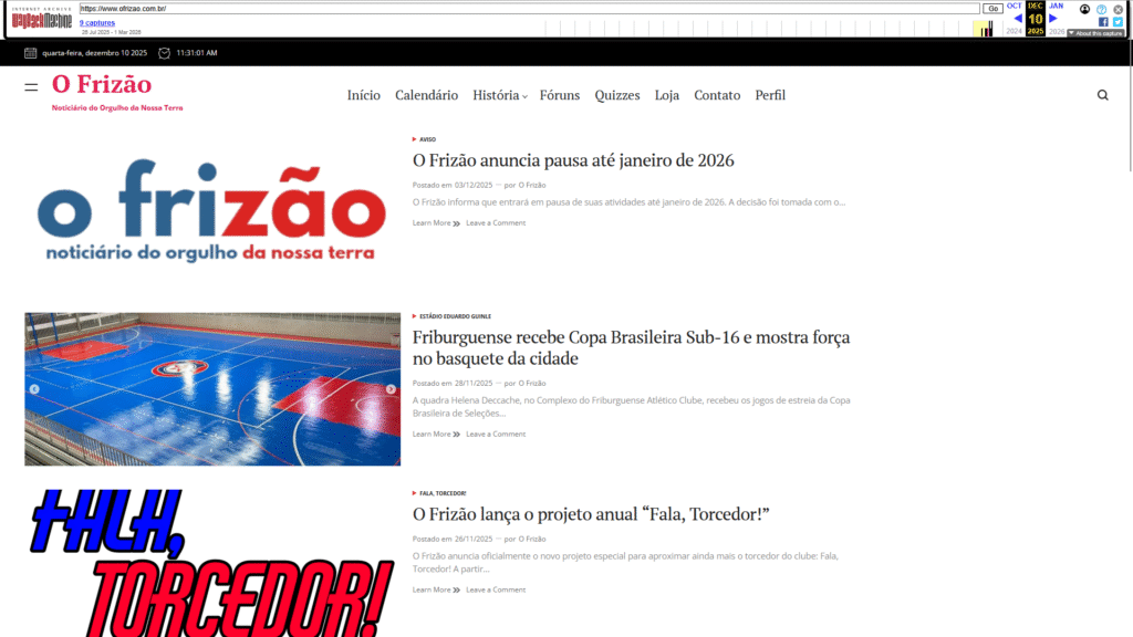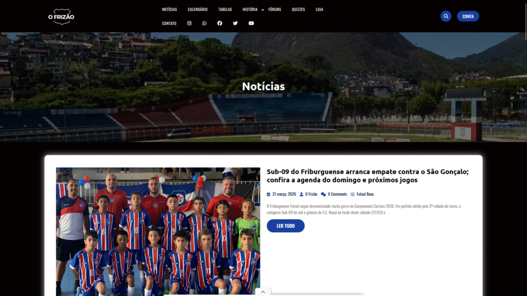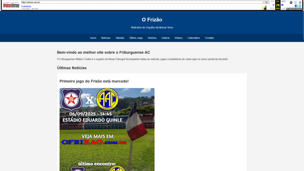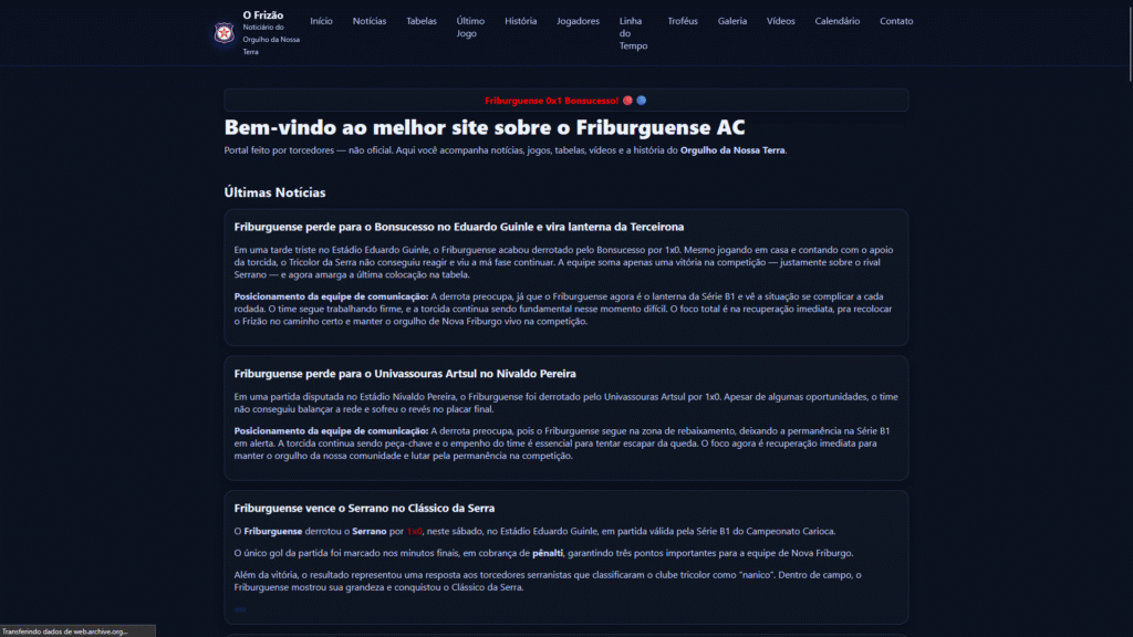 - Julho de 2025: Deixamos a “zoeira” de lado para assumir um compromisso maior. Rebatizamos o projeto como O Frizão – Noticiário do Orgulho da Nossa Terra. Lançamos nossa primeira versão do site, focada em trazer a notícia completa e ainda sem o fórum para os torcedores.